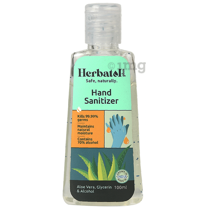 Herbatol Plus Hand Sanitizer with the goodness of aloe vera and glycerin for natural protection without drying the skin. Aloe Vera's powerful antioxidant properties protect and hydrate the skin. It relieves skin irritation while eliminating dryness. Glycerin locks natural moisture in the skin while defending it against irritants. It contains 70% alcohol which kills 99.99% germs. Rinse-free and non-sticky. Use it during a commute, while at work, before meals, while accessing doors and handles, grocery shopping and using ATM machines. Proudly made in India.
