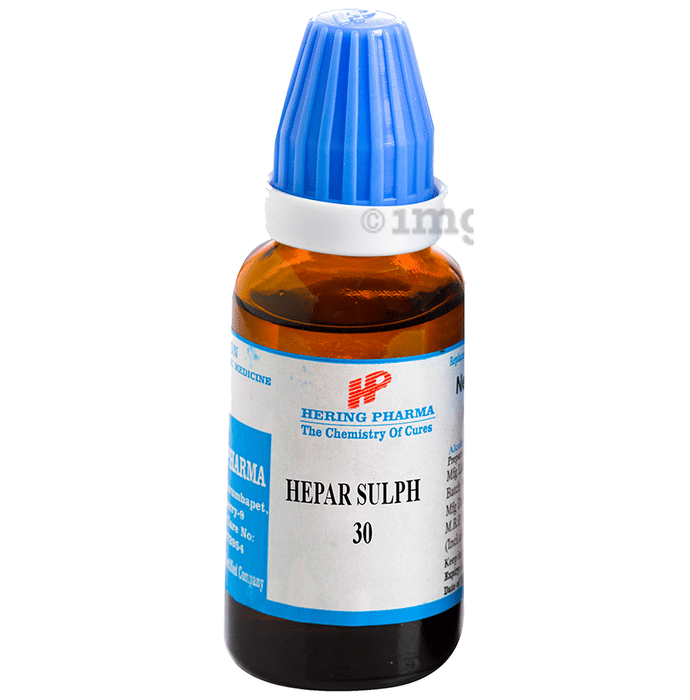 Hering Pharma Hepar Sulph Dilution 30 is a homoeopathic formulation used for glandular inflammation and eruptions. It reduces painful neck swelling and burning sensation in the body.