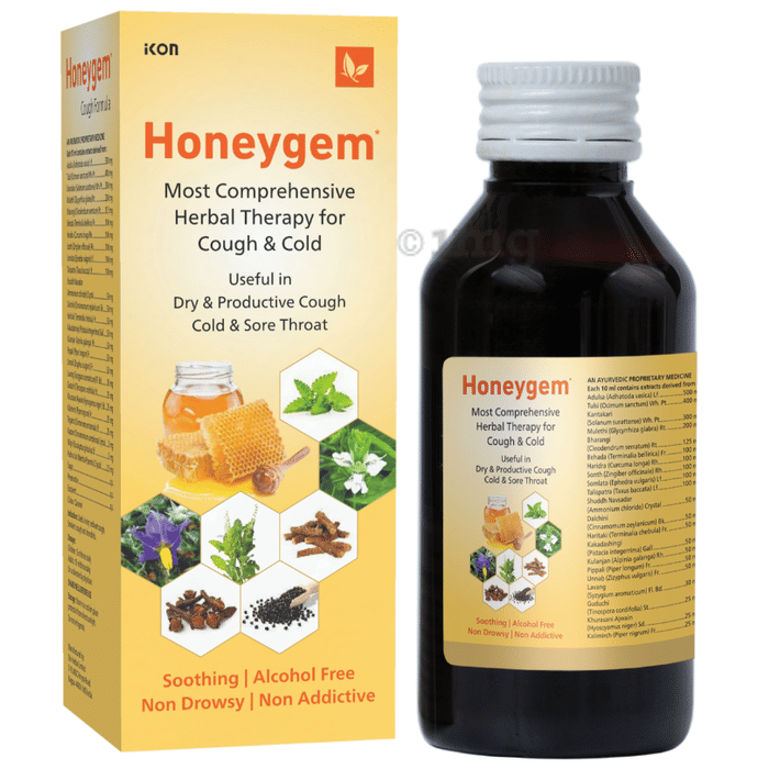 Ayurveda prescribes several herbs that are beneficial in alleviating cough and its symptoms. Honeygem Cough Syrup is an Ayurvedic herbal cough syrup formula comprising the goodness of herbs such as Adulsa, tulsi, mulethi, kantakari, sonth and pippali, which has been reported to provide effective relief in cough without causing adverse effects. Its contents, such as kalimirch and haridra, are also reported to possess additive benefits in relieving symptoms of acute non-productive cough. This non-drowsy herbal supplement has amazing anti-inflammatory compounds that can relax the airways' membranes, reducing coughing. Honeygem Cough Syrup is beneficial for common cough, sneezing, runny nose, nasal congestion and sore throat. It is also effective for all kinds of whooping cough. It ensures relief in respiratory tract infections and liquefies and expels viscous secretions in distressing &and irritating coughs. Also helpful with the smoker’s cough and singer’s cough. It soothes respiratory passages and improves sleep quality.