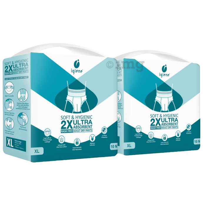 Igiene Soft and Hygienic 2X Ultra Absorbent Rashfree Adult Dry Pant are made of soft, breathable fabric with quick absorption, Igiene adult dry pants are designed for easy adjustments and maximum comfort. They are enriched with the goodness of aloe vera for smooth and clean skin. They are also equipped with a wetness indicator for convenient usage. The diapers also have properties of odour control and leakage guard to manage any spillage.