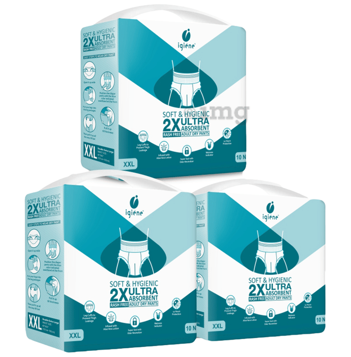Igiene Soft and Hygienic 2X Ultra Absorbent Rashfree Adult Dry Pant are made of soft, breathable fabric with quick absorption, Igiene adult dry pants are designed for easy adjustments and maximum comfort. They are enriched with the goodness of aloe vera for smooth and clean skin. They are also equipped with a wetness indicator for convenient usage. The diapers also have properties of odour control and leakage guard to manage any spillage.