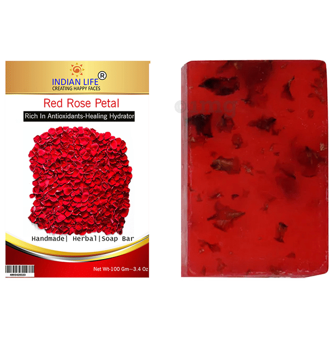 Indian Life Red Rose Petal Soap Bar is a handmade soap that can help remove dullness and restore the skinโs natural glow. It might cleanse, soothe, and stimulate the skin. It may maintain the skinโs natural moisture level and make it radiant. The soap can help remove excess oil from the skin without drying. Rose may aid in reducing the appearance of blemishes. It can help protect the skin against irritants.