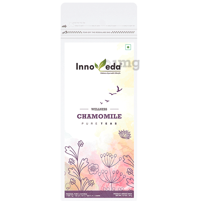 Innoveda Wellness Chamomile Pure Tea is golden in color and has a delectable, fruity flavor. This herbal remedy acts as a natural cleanser accelerates the healing process. It helps reduce puffiness under the eyes, and dark circles, enriches the hair color and radiance, calms muscle pain, and boosts immunity. Chamomile tea is an all-natural skin bleach. It lightens the complexion and renders it a healthy glow.