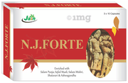 Jain N.J. Forte Capsule contains safed musli, ashwagandha, purified ahilajit, gokshura, and konch beej. With a unique composition of 33 ayurvedic herbs, NJ FORTE is designed to maintain stamina, strength, energy, and power, empowering individuals to excel in their endeavours and embrace a vibrant, healthy lifestyle. It contains the finest natural and safe ingredients to help in rejuvenation. It reduces stress, maintains stamina, enhances mood, maintains vitality, and enhances performance. It is formulated entirely from the goodness of herbal and ayurvedic elements. It is naturally safe and non-habit forming.