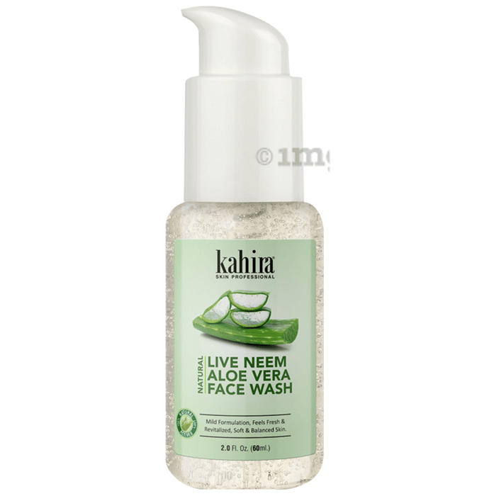 Kahira Natural Live Neem Aloe Vera Face WashThe deep cleansing action of Kahira Neem and Aloe Vera Face Wash helps remove all the impurities from the pores and gives a squeaky clean and smooth skin. It is a gentle and exfoliating Face Wash that helps maintain the natural moisture barrier of the skin. The powerful properties of Neem and Aloe Vera help purify the skin and prevent the outbreak of pimples and acne.