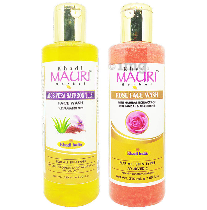 Khadi Mauri Herbal Combo Pack of Aloevera Saffron Tulsi & Rose Face Wash (210ml Each) is suitable for all skin types; this gentle face wash uncovers skin natural brightness removing all signs of tan. It helps repair the sun damage causes by exposure to the harsh rays of the sun. It protects the skin cells from free radical damage and lightens the skin tone improving the skin complexion.
