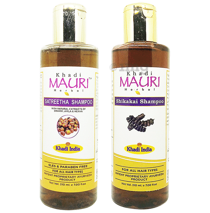 Khadi Mauri Herbal Combo Pack of Satreetha & Shikakai Shampoo Herbal Satreetha Shampoo is an ayurvedic product for all hair types. It contains a potent combination of mild ayurvedic herbs that gently cleanse the hair and scalp without hair-damaging side effects. It helps to fight dandruff and condition the hair. It helps soften the hair and brings back lost shine, bounce and good health. It is free of SLES and parabens and is suitable for all hair types. Herbal Shikakai Shampoo contains natural extracts of herbs which impart shine to hair and promote hair growth and nourishment to hair and scalp, leading to soft, smooth, lustrous and damage-free hair. It controls hair fall, prevents dryness and detangles hair. It cleans the scalp without affecting the natural pH. It slows down the premature greying of hair.