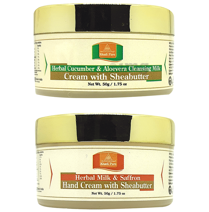 Khadi Pure Combo Pack of Herbal Cucumber Aloevera Cleansing Milk Cream with Sheabutter and Herbal Milk and Saffron Hand Cream with Sheabutter Khadi Pure Herbal Cleansing Milk Cream Cucumber and Aloevera with Sheabutter is a completely herbal product with a special combination of essential oils and botanical extracts to improve overall skin conditions. The result is a barrier that forms over the membrane, which keeps the moisture intact. This cream helps moisturise the skin and retains natural softness.