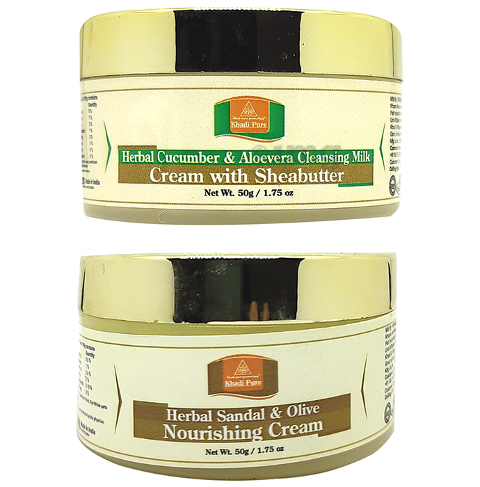 Information about Khadi Pure Combo Pack of Herbal Cucumber & Aloevera Cleansing Milk Cream with Sheabutter & Herbal Sandal & Olive Nourishing Cream (50gm Each)