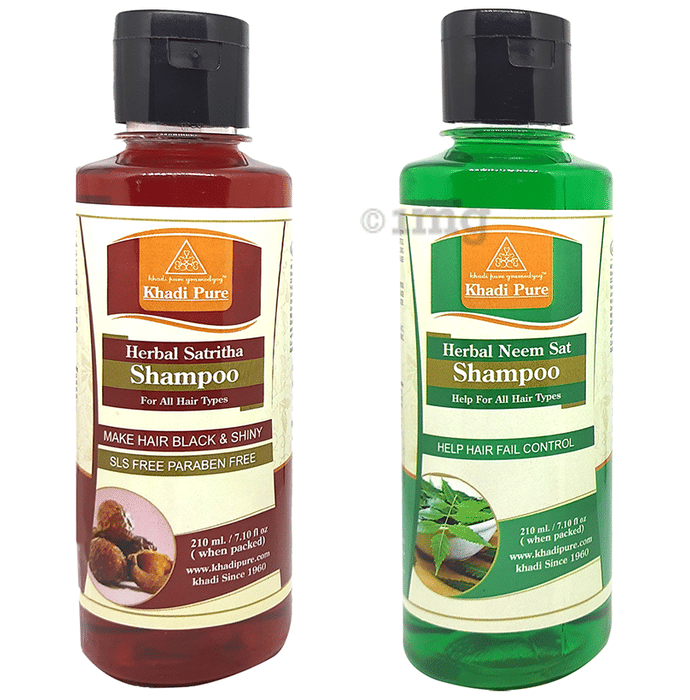 Khadi Pure Combo Pack of Herbal Neem Sat Shampoo & Herbal Satritha Shampoo SLS Free & Paraben Free Herbal Neem Sat Shampoo prevents itchy and inflamed scalp. It helps clear and clean the scalp, reduces itchiness and keeps it healthy. Properties of Neem Sat heal and soothe itchy scalp by preventing microbial infections. It nourishes dry and scaly scalp. Herbal Satritha Shampoo is suitable for all hair types. It has ayurvedic natural hair and scalp cleansing herbs and oils for complete care and cleanliness. It provides nourishment and reduces dandruff.
