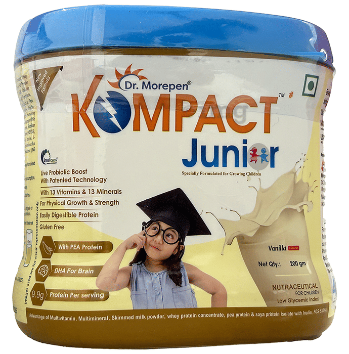 Kompact Junior Powder is a health supplement used for complete nutrition of children, promotes growth and development in children and promotes brain development. It contains natural and easy to digest protein sources. It is a rich source of essential vitamins and minerals required for growth of children.
