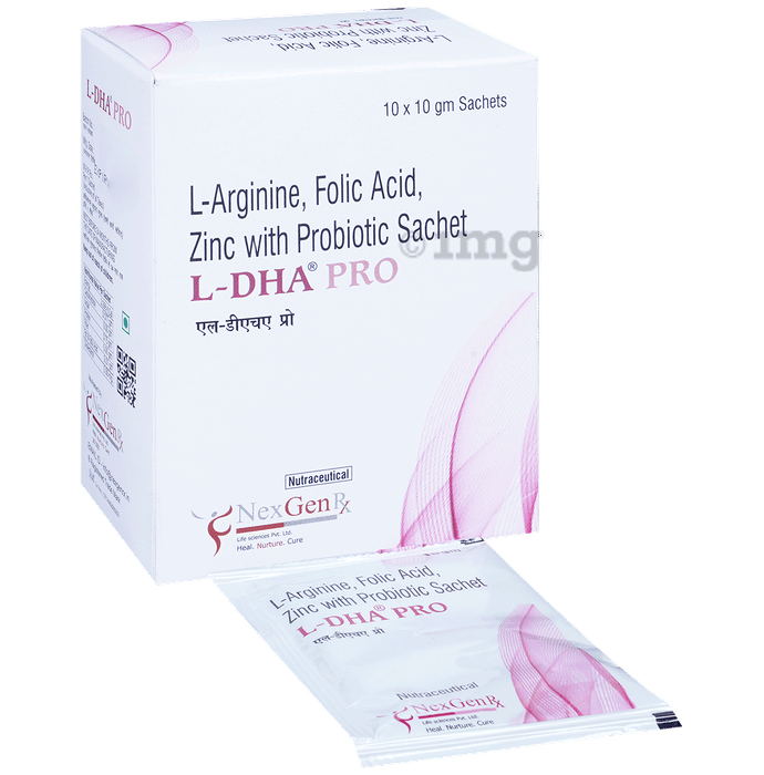 L Dha Pro Granules is a dietary supplement used to manage intrauterine growth restriction (a baby in the womb not growing as expected). It contains L-arginine, lycopene and zinc as active ingredients that help prevent fetal growth restrictions. It may prevents the risk of Preeclampsia and Intrauterine growth retardation and is used as a dietary supplement that improves immune functions.