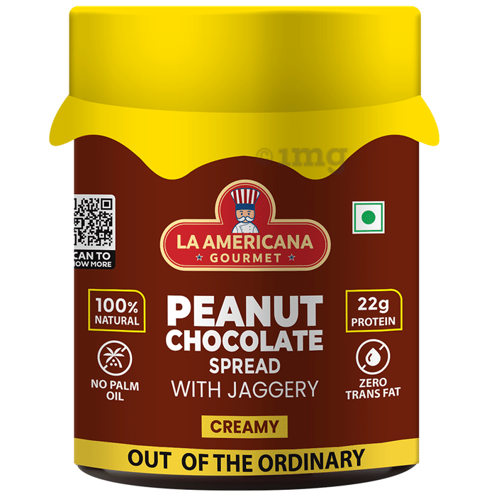 LA Americana Gourmet Peanut Chocolate Spread with Jaggery Creamy is a creamy and chocolaty nut spread that may satiate sweet cravings. It is made with peanuts with a blend of jaggery and chocolate. It can be a healthy option for individuals on a diet, joggers, and fitness enthusiasts who prefer checking their sugar intake.