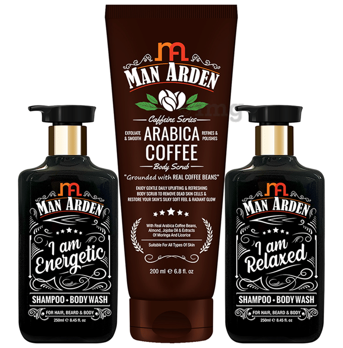 Man Arden Combo Pack of I Am Energetic Shampoo + Body Wash (250ml), Arabica Coffee Body Scrub (200ml) & I Am Relaxed Shampoo + Body Wash (250ml)