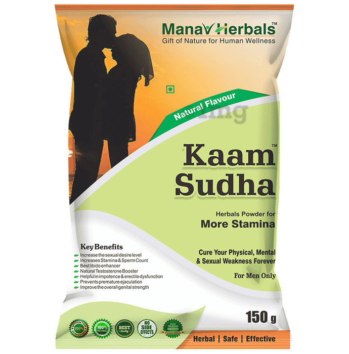 Manav Herbals Kaam Sudha Powder is a potent ayurvedic formulation specifically crafted to help address mental and physical weaknesses. This supplement enhances stamina and vigour, promoting overall health. It can be taken by any man of 18-65 years of age, to deal with physical and mental weakness. Apart from this, people who want to boost their stamina and power can also take it.