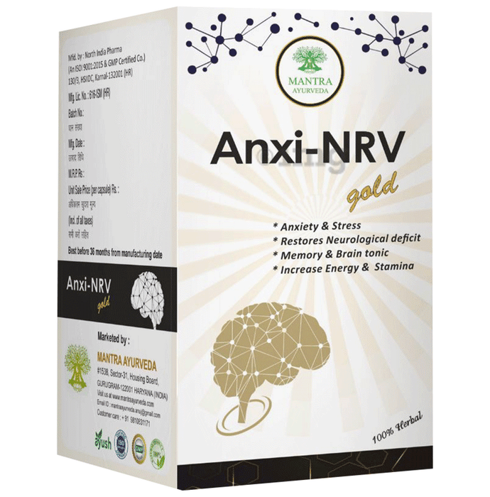 Mantra Ayurveda Capsule Anxi-NRV Gold helps in managing anxiety, stress, headaches, and migraines. It helps maintain brain health and memory. Additionally, it offers relief for IBS, gastric dysmotility, and constipation. The inclusion of khas khas induces sleep and alleviates stress. Ashwagandha calms the brain, reduces swelling, and enhances overall stamina.