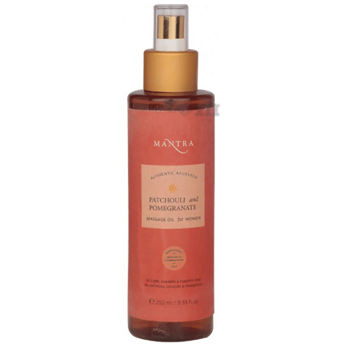 Mantra Patchouli and Pomegranate Massage Oil for Women is a potent combination of cold pressed sesame oil and pomegranate extracts ideal for enhancing feminine beauty. Sesame oil exfoliates dead skin, bringing a youthful radiance to skin. Extracts of majuphal and nagbala have a toning and firming effect on the skinβs appearance. While gambhari tones the muscles, kapoor kacheri oil eliminates body odour and leaves a gentle lingering fragrance.