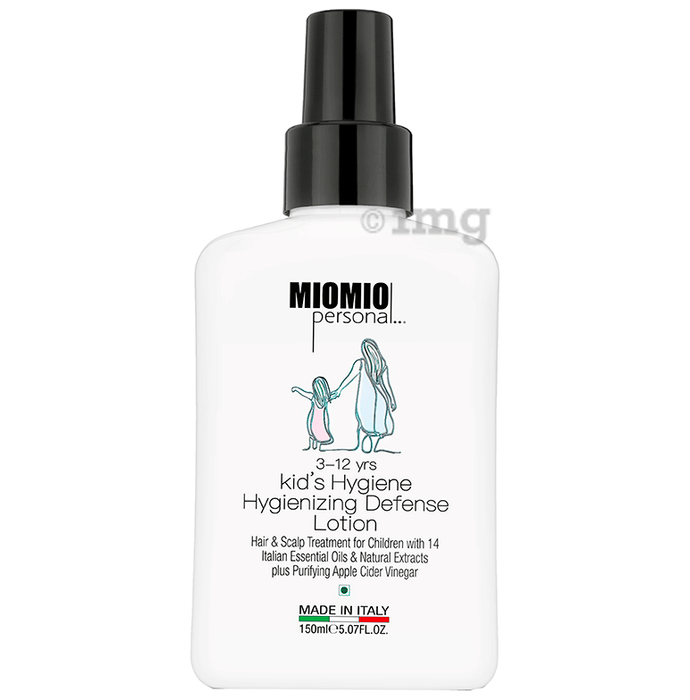 Miomio Personal 3 to 12 Yrs Kid's Hygienizing Defense Lotion has a formula specially designed for children’s hair and scalp 3-12 years. It makes hair shiny and soft and leaves the skin clean, nurtured and protected. Formulated with high concentrations of specific anti-bacterial essential oils and elements known to be an adjuvant in the prevention of germs and parasites. The formulas meet the eco-green vegan-friendly cosmetics standards for safety and sustainability.