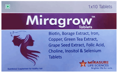 Miragrow Tablet contains essential nutrients which help in maintaining healthy hair, skin and nails. Enriched with biotin, borage oil, choline, selenium and grape seed extract, it helps strengthen hair roots and reduces hair fall effectively. It helps in nourishing the skin and also aids in strengthening the nails.