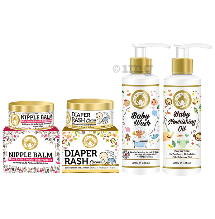 Mom & World Combo Pack of Nipple Balm (50gm), Diaper Rash Cream (50gm), Baby Wash (200ml) & Baby Nourishing Oil (200ml)