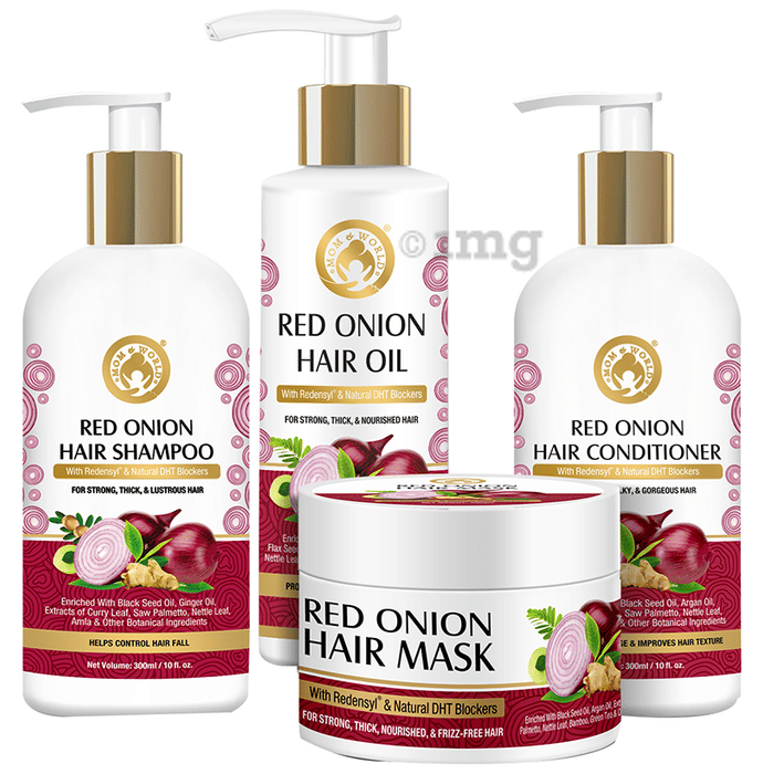 Information about Mom & World Combo Pack of Red Onion Hair Shampoo 300ml, Red Onion Hair Conditioner 300ml, Red Onion Hair Oil 200ml & Red Onion Hair Mask 200ml