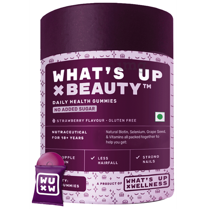 What's Up Wellness What's Up X Beauty Daily Health Gummies Strawberry is a gummy supplement designed for thinning hair, lacklustre skin and brittle nails. A delicious blend of essential vitamins and superfoods in the form of cute hair growth gummies that will improve the quality of your hair, skin, and nails. These strawberry-flavoured chewable hair gummies for hair growth contain biotin and zinc. The gummies can help stimulate the skin making it soft and strengthening the nails. The formulation contains antioxidants, vitamins, minerals, and more.