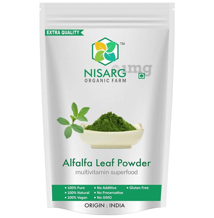 Nisarg Organic Farm Alfalfa Leaf Powder contains essential vitamins including the entire spectrum of B- vitamins A, D, E and K. Alfalfa powder is a source of iron, niacin, boitin, folic acid, cacium, magnesium, phosphorus and pottasium. It helps in cleansing the blood, helps in alleviating allergies, aids in blood clotting, promotes healthy digestion and can ease morning sickness.
