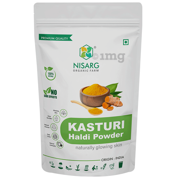 Nisarg Organic Farm Premium Quality Kasturi Haldi Powder is a natural and versatile herbal product known for its various skincare and wellness benefits. Derived from the dried rhizomes of Curcuma aromatica, commonly known as wild turmeric or kasturi haldi, this fine powder is celebrated for its traditional and holistic applications. It is used in beauty treatments to potentially help ease acne, brighten and whiten skin tone, lighten scars and acne marks, and as an antiseptic topically.