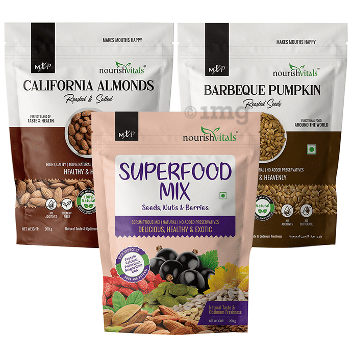 Information about NourishVitals Combo Pack of California Almonds Roasted & Salted, Superfood Mix and Barbeque Pumpkin Roasted Seeds (200gm Each)