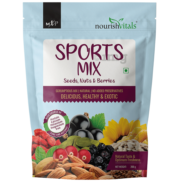 NourishVitals Sports Mix Seeds, Nuts and Berries is a healthy mixture that you can eat at any time. The seeds, nuts, and berries enrich your diet with nutrients giving several benefits to enhance overall health and wellbeing. It has antioxidant properties and can also keep your gut healthy. It helps to reduce your cravings and takes care of your health.