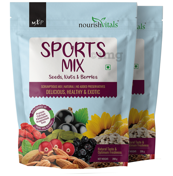 NourishVitals Sports Mix Seeds, Nuts and Berries is a healthy mixture that you can eat at any time. The seeds, nuts, and berries enrich your diet with nutrients giving several benefits to enhance overall health and wellbeing. It has antioxidant properties and can also keep your gut healthy. It helps to reduce your cravings and takes care of your health.