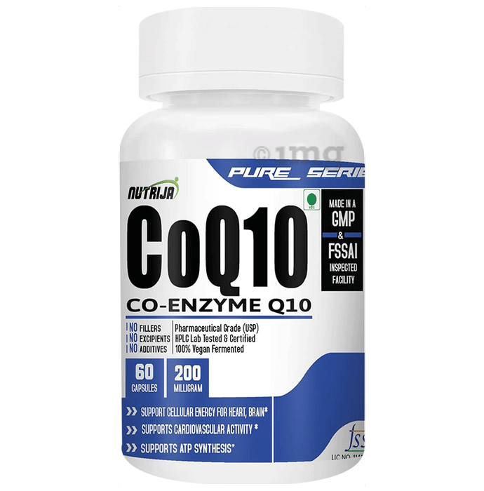 Nutrija CoQ10 Co-Enzyme Q10 200mg Capsule provides 200mg of pure CoEnzyme Q10 with 10mg of Bioperine to promote optimal absorption and assimilation. Coenzyme Q10 (CoQ10) is a substance similar to vitamins that supports overall well-being. Nutrijaβ’ COQ 10 contains a superior form of Ubiquinol (reduced form) which contributes to synthesising ATP molecule, the major energy source of cells in mitochondria that may help in improving cardiovascular health, enhance blood flow, and aid in muscle recovery and performance.