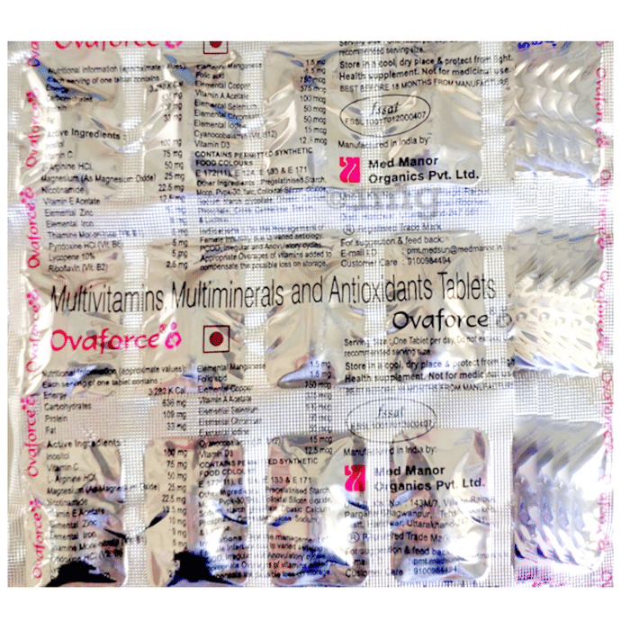Ovaforce Tablet is a dietary supplement containing essential vitamins like pyridoxine, folic acid, and vitamin B12 and minerals like iron, zinc, and selenium, and antioxidants. This formulation can help increase red blood cell production, promote immune function, support brain and nervous system health, and regulate blood pressure levels.