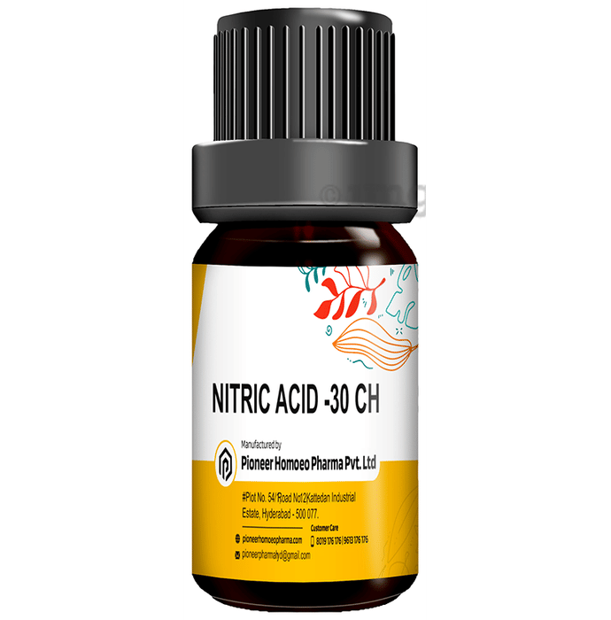 Pioneer Pharma Nitric Acid 200 CH is a homoeopathic remedy that helps to get relief from skin disorders caused due to splinters and heal ulcers of the mouth. It can help with fissures and sacral back pain. It helps with hearing disorders as well