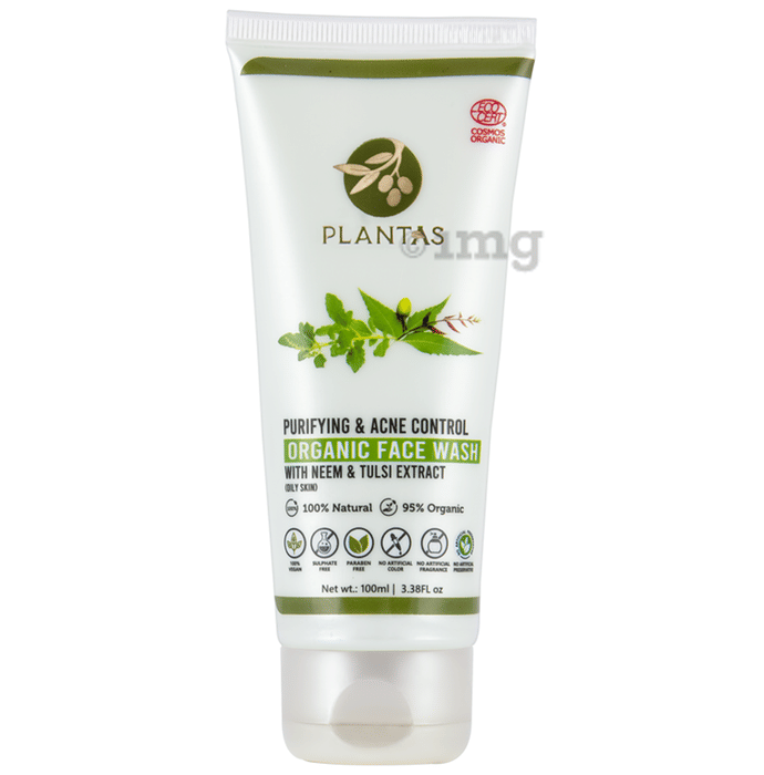 Plantas Purifying and Acne Control Organic Face Wash is a purifying and acne control organic face wash with Neem and Tulsi extract. It is suitable for oily skin and can prevent blemishes caused by acne. The face wash is certified by Ecocert Greenlife, France, under the Cosmos V3 standard.