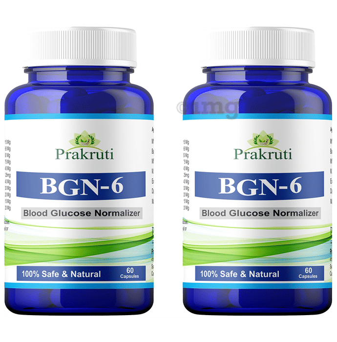 Prakruti BGN-6 capsuleBGN-6 (Blood glucose normaliser ), an ayurvedic formulation for diabetes blood sugar control, is a blend of authentic ayurvedic formulas. It can be helpful for type 1 and type 2 diabetes. It has anti-diabetic properties since it converts starch into energy and regulates blood sugar levels.