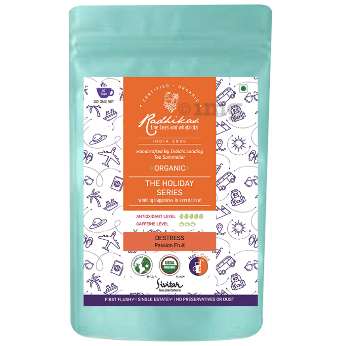 Radhikas Fine Teas Destress Passion Fruit Organic The Holiday Series Tea Leaves Experience the delicious bite and flavorful burst of passion fruit blended with the purest Darjeeling leaves as fresh as the Himalayan air. Radhika's fine teas promise a magical delight with our biodynamic, single-origin leaves flushed in early spring to bring you a pack of fresh tea. The natural passion fruit, known for its immense antioxidant properties, blends seamlessly with the Darjeeling leaf creating an aromatic tea infused with healthy nutrients. With no added sugar or sweeteners, enjoy plantation-fresh, tasty tea.