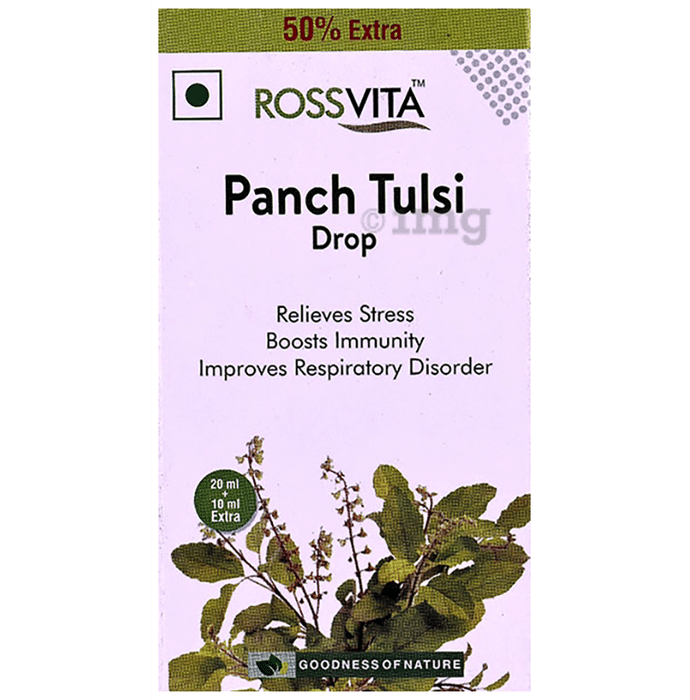 Rossvita Panch Tulsi Drop contains 5 types of Tulsi extracts (Shyam Tulsi, Van Tulsi, Ram Tulsi, Arjak Tulsi and Kapoor Tulsi. It is extremely effective in treating cough, cold, acidity, constipation, stomach pain, abdominal pain, and even viral or seasonal fever, Panch Tulsi uses even include treating many kinds of gynaecological problem, swelling in the lungs, hypertension, chest congestion, fatigue, vomiting, obesity, arthritis, asthma, anaemia, and ulcers.