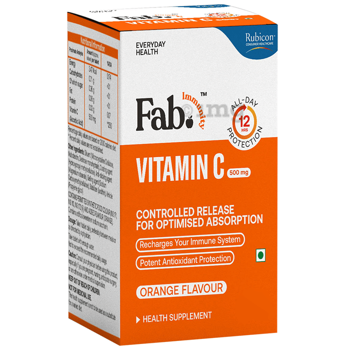 Rubicon Fab Immunity Vitamin C 500mg Controlled Release Tablet Orange are the first of their kind in India. Our patented formula uses cutting-edge science to ensure Vitamin C is released continuously in your system for up to 12 hours for all-day immune support. This provides superior bioavailability and protection compared to conventional immediate-release tablets.