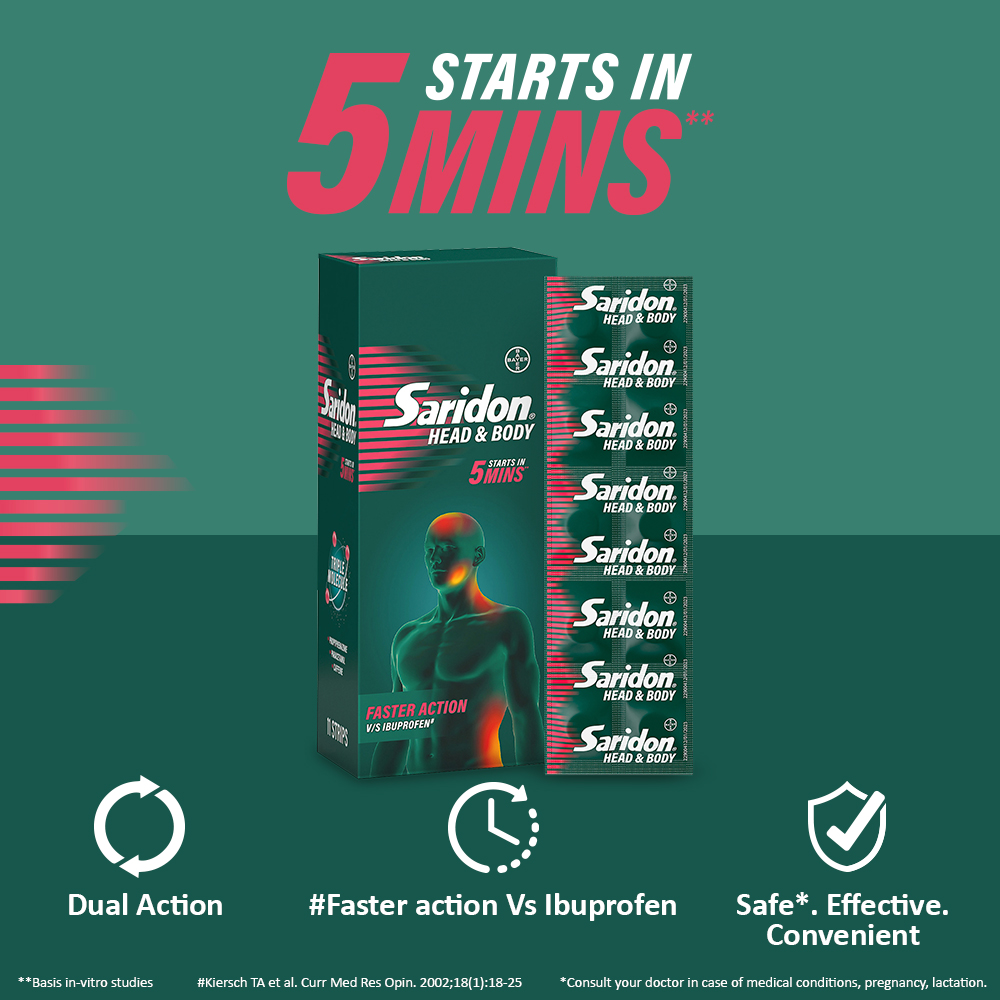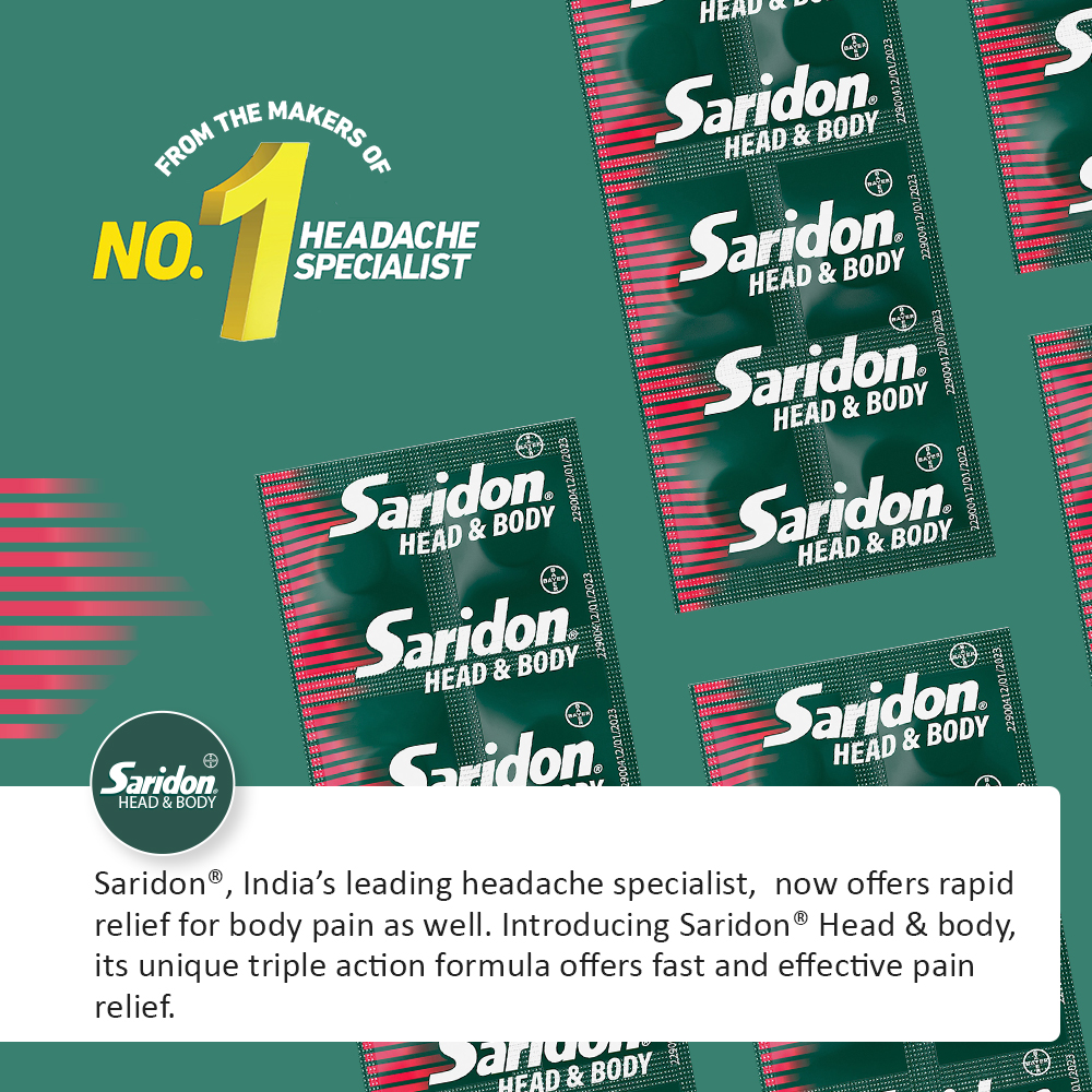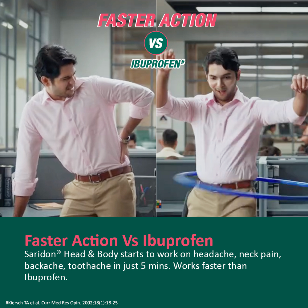 Saridon Head and Body Tablet Saridon head and body provides dual relief from both headaches and body pains. It has a triple molecule formula and has a faster action than ibuprofen and plain paracetamol.