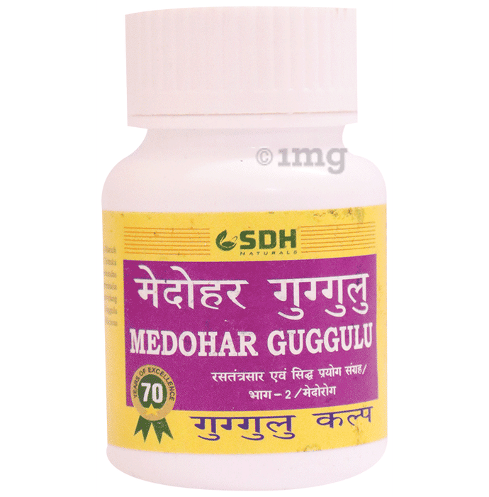 SDH Naturals Medohar Guggulu contains saunthi, kali mirch, pipal, chitrakmool, Nagarmotha, vavidang, guggulu, and erand tail as the main active ingredients. Vyas Medohar Guggulu Tablet burns body fat, improves digestive functions and is effective in rheumatic and respiratory disorders.
