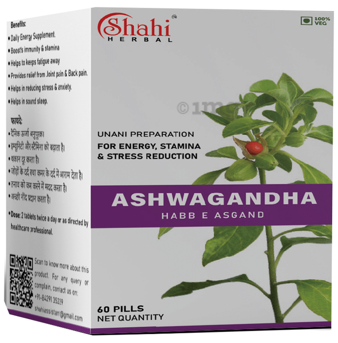 Shahi Herbal Tablet Ashwagandha Habb E Asgand is packed with a blend of asgand nagaori, bekhae filfil, filfil daraz, maida lakdi, musli safed, ajwain, shatavari and zanjabeel, which helps you to maintain energy, and stamina for daily work and helps in stress reduction and sound sleep.