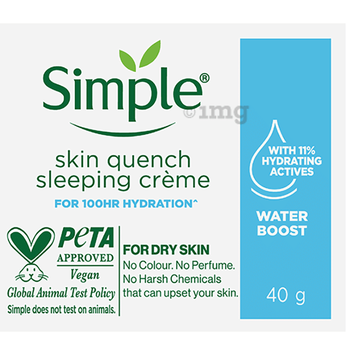 Simple Skin Quench Sleeping Creme provides 100 hour hydration. It is a special blend of 11% hydrating actives to help restore the hydration of skin overnight. The specially blended hydrating gel creme boosts skin's natural hydration process overnight to give soft, supple and smooth skin, in the morning. Our Water Boost Night Creme is infused with. Simple Water Boost Skin Quench Sleeping Creme like all Simple products contains no colour or dye, no alcohol, and no artificial perfume. We’re dermatologically tested and approved, and ophthalmologically tested. Specially designed for sensitive skin users, we’re tested and approved hypoallergenic and non-comedogenic. This face moisturiser night cream is also suitable for oily, dry and combination skin for both men and women.