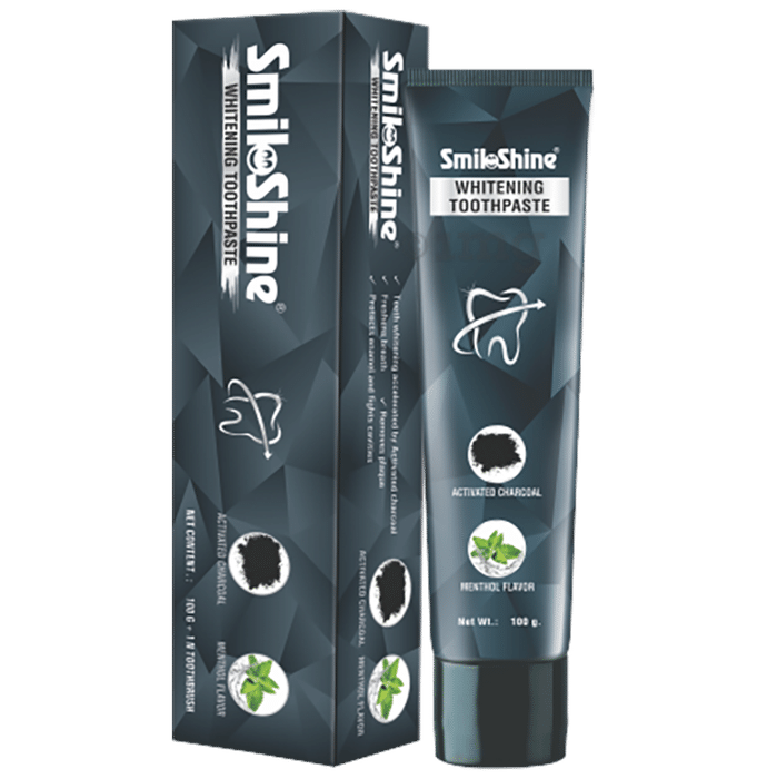 Smiloshine Teeth Whitening Toothpaste with activated charcoal contains the additional power of sodium chlorite for teeth whitening. It is a specially formulated foaming fluoridated toothpaste for all ages. It freshens the breath with menthol flavour, removes plaque, protects enamel and fights against cavities.
