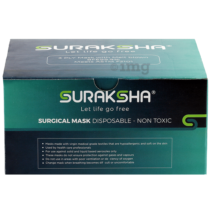 Suraksha 3 Ply Disposable Surgical Mask is made of non-toxic, non-woven fabric. It is a 3-layer mask for better protection. It is helpful in theatres and other sterile areas in hospitals. It is also used by dentists