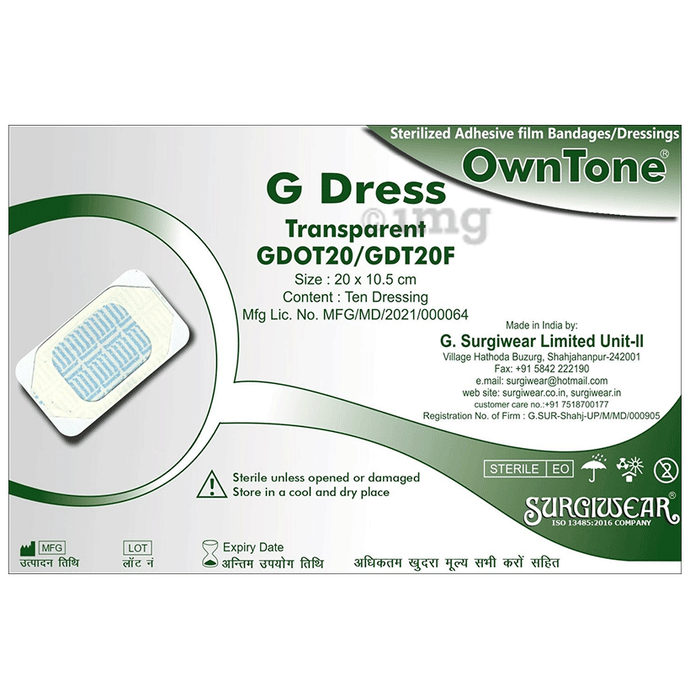 Surgiwear GDOT20 / GDT20F OwnTone G Dress Transparent (Without Pad) 20 x 10.5cm is a sterile, waterproof, and breathable bandage designed to cover wounds post-surgery or trauma. Made from soft elastic thin film, this transparent dressing comfortably conforms to the skin, allowing perspiration to evaporate while protecting wounds from water and external contaminants. Suitable for use during bathing and swimming, the dressing is available in various sizes and pack configurations, making it ideal for diverse wound care needs.