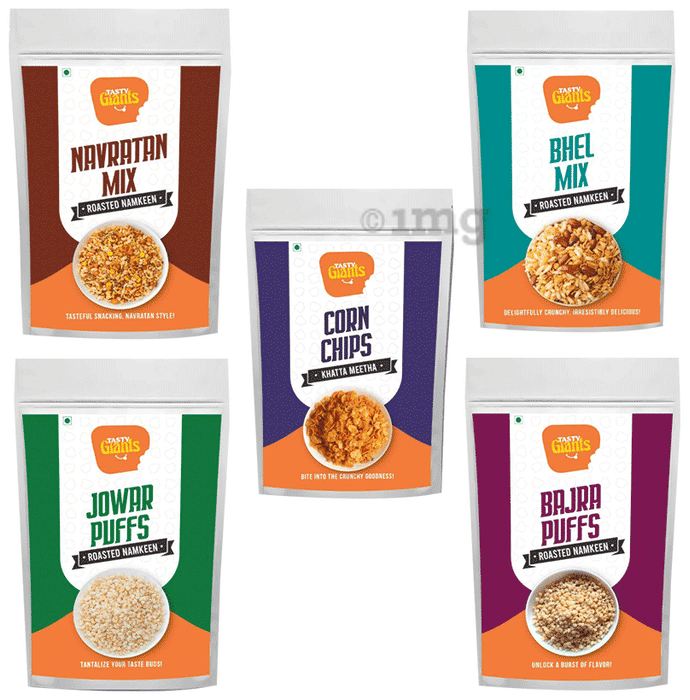 Tasty Giants Combo Pack Roasted Snacks offers an assortment of crunchy, savoury snacks, including roasted jowar and bajra puffs, corn chips, navratan, and bhel mix. All the snacks are lightly salted and made with real ingredients. These snacks can be had alone or paired with a dip or spread for a flavourful experience.