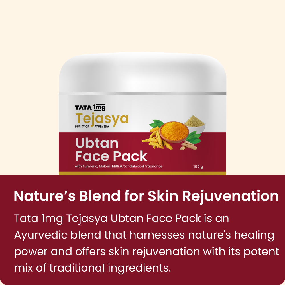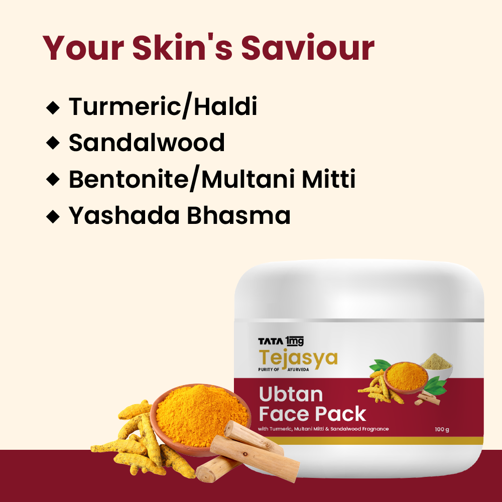 Tata 1mg Tejasya Ubtan Face Pack brings the goodness of ayurvedic traditional therapy. It is made from natural ingredients such as turmeric, multani mitti, yashadha bhasma, which are known for skin healing and soothing properties. This face pack is useful for acne, rashes, and sunburn and provides cooling and healing effects to the skin.