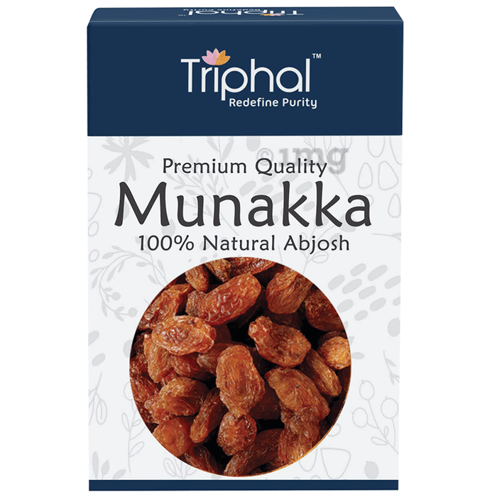Triphal 100% Natural Premium Quality Munakka are a rich source of fibre, iron, calcium, potassium, and other essential nutrients that may help improve hair health and make the skin glow. It can help boost immunity and relieve dry cough. It may aid in maintaining a healthy weight and is a source of vitamins and minerals.