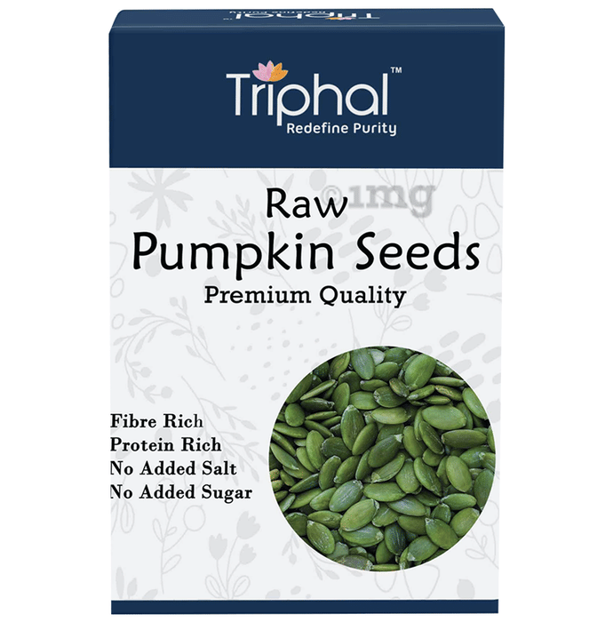 Triphal Pumpkin seeds contain protein, zinc, and iron. Pumpkin seeds are suitable to be used for snacking, baking, or as salad toppings. Pumpkin Seeds can be safely added to your granola bars, smoothies, raitas, salads, etc.